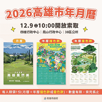 2026「高雄果然美」水果月曆及2款手繪年曆,將於12月9日上午10點起在高雄市政府四維及鳳山行政中心、38個區公所同步發送,每人可索取月曆1份及年曆任1款,數量有限,送完為止。