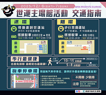 本次活動機車臨時停放區規劃於世運主場館西南側、軍校路(世運大道至海功路)西側及軍校路西側眷村(緯一路至緯四路),開放時間為12月6日、7日8時至23時,欲騎車前往會場的市民朋友可多加利用,並留意開放時段,務必準時離場。